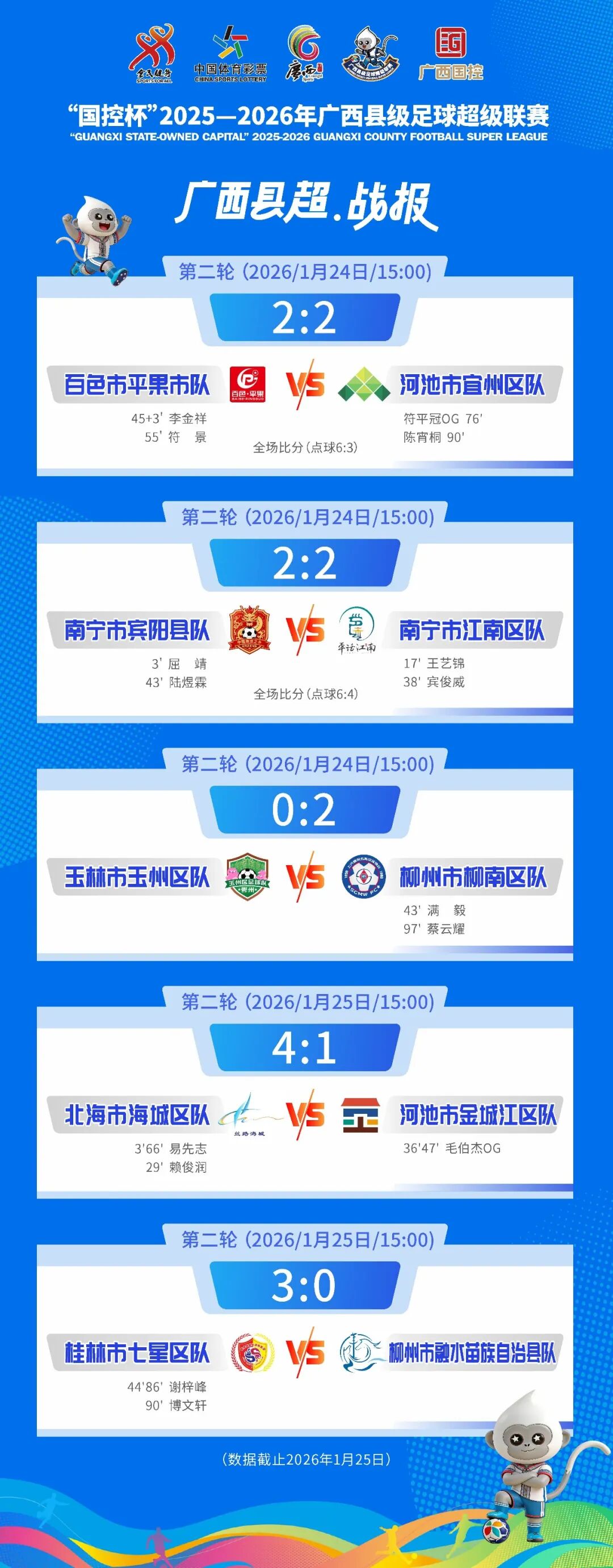 1月24日—25日,“國控杯”2025-2026年廣西縣級足球超級聯(lián)賽第二輪賽事圓滿落幕。桂西、桂北兩大賽區(qū)5場焦點對決輪番上演,點球大戰(zhàn)、梅開二度、讓二追二等精彩瞬間接連涌現(xiàn),速覽下方戰(zhàn)報,一起回顧綠茵場上的燃情時刻!