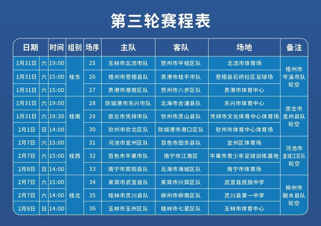 根據(jù)賽程,1月31日(本周六)起,“國控杯”2025-2026年廣西縣級足球超級聯(lián)賽第三輪賽事將精彩上演,你期待嗎?