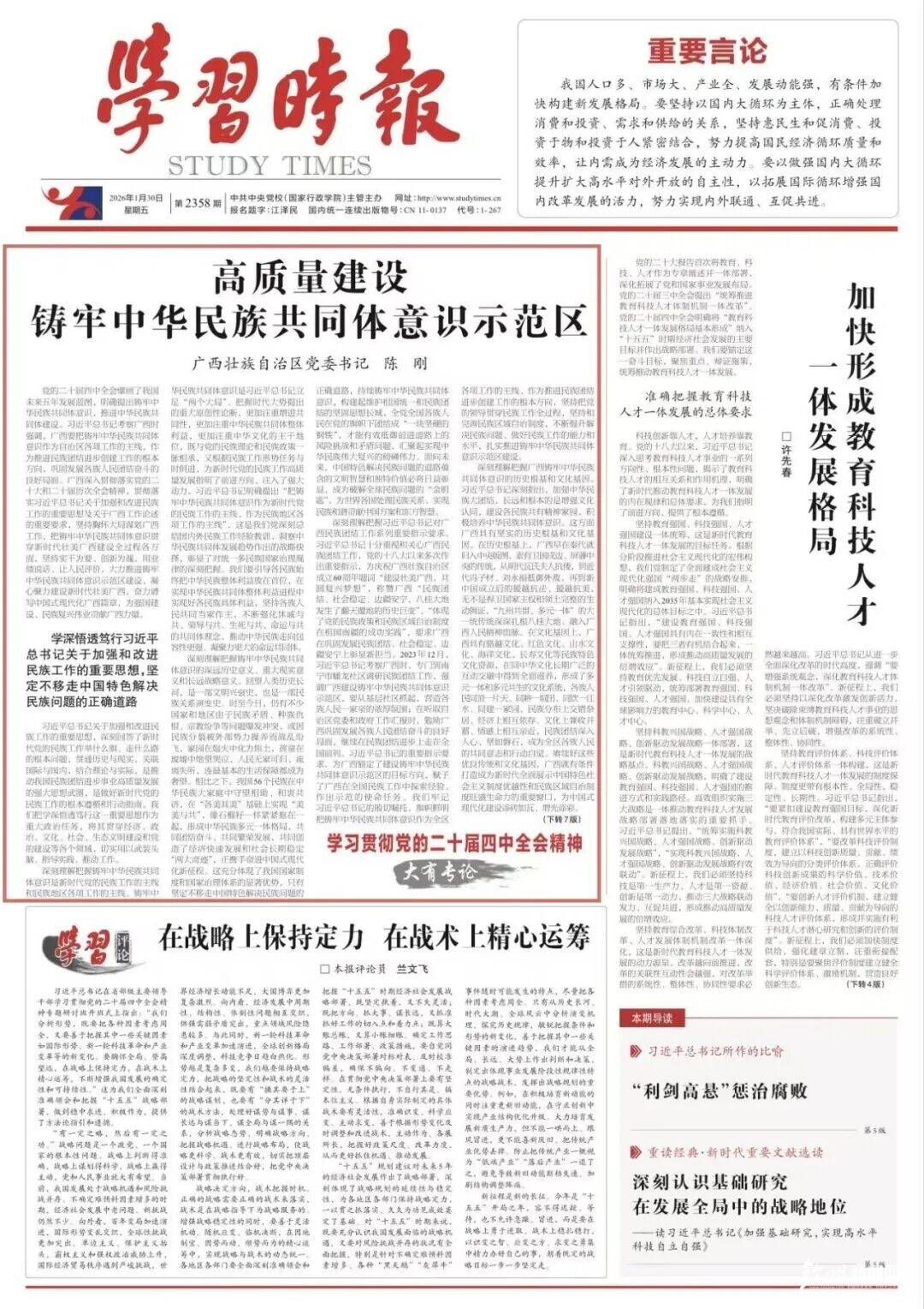 黨的二十屆四中全會擘畫了我國未來五年發展藍圖,明確提出鑄牢中華民族共同體意識,推進中華民族共同體建設。習近平總書記考察廣西時強調,廣西要把鑄牢中華民族共同體意識作為自治區各項工作的主線,作為推進民族團結進步創建工作的根本方向,鞏固發展各族人民團結奮斗的良好局面。廣西深入貫徹落實黨的二十大和二十屆歷次全會精神,貫徹落實習近平總書記關于加強和改進民族工作的重要思想及關于廣西工作論述的重要要求,堅持胸懷大局謀劃廣西工作,把鑄牢中華民族共同體意識貫穿新時代壯美廣西建設全過程各方面,堅持實干為要、創新為魂,用業績說話、讓人民評價,大力推進鑄牢中華民族共同體意識示范區建設,凝心聚力建設新時代壯美廣西,奮力譜寫中國式現代化廣西篇章,為強國建設、民族復興偉業貢獻廣西力量。